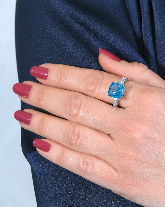 Anillo con piedra color aguamarina talla cojín