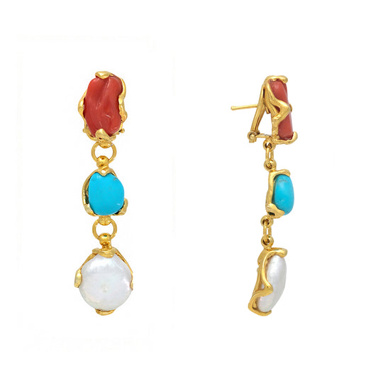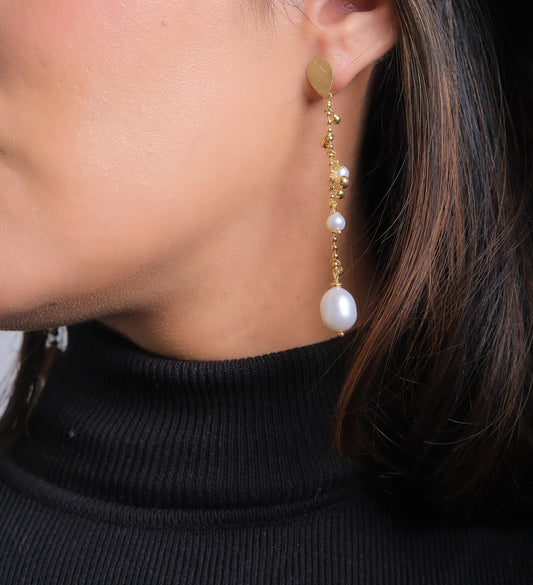 Pendientes con baño de oro largos con cadena bolitas y perlas cultivadas