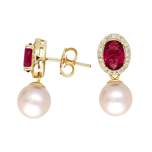 Pendientes con baño oro roseta color rubi y perlas cultivadas
