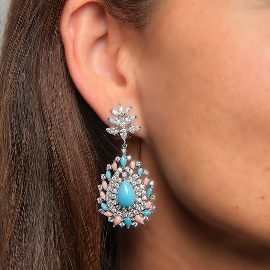 Pendientes largos en plata cuajado en circonitas y piedras coral y turquesa