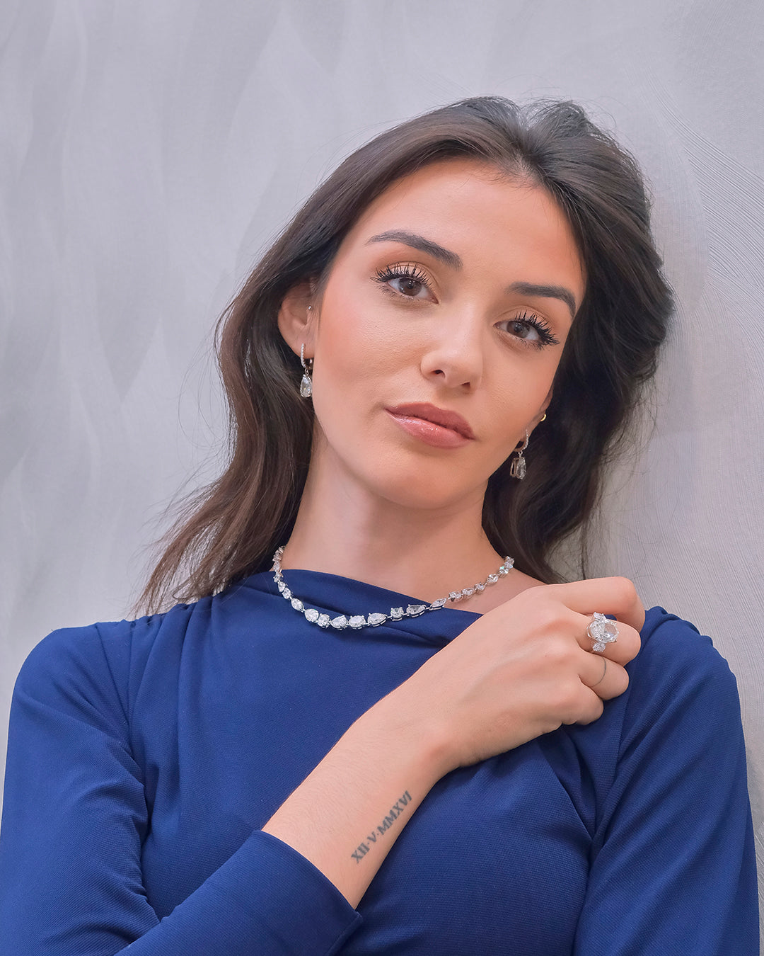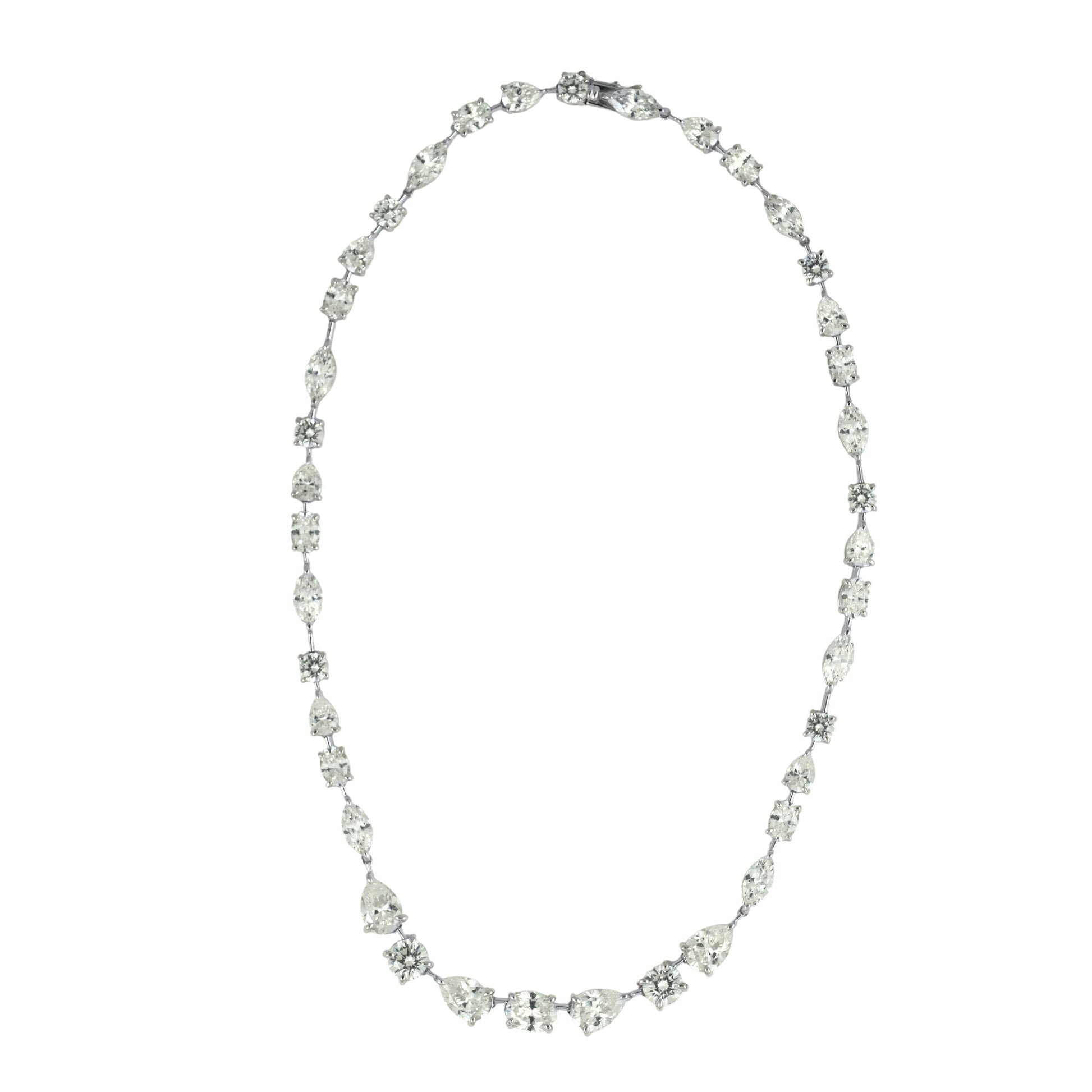 | Gargantilla en plata con piedras hidrotermal color diamante combinando talla pera, navette, brillante y oval, cierre doble de seguridad, largo 38cm |