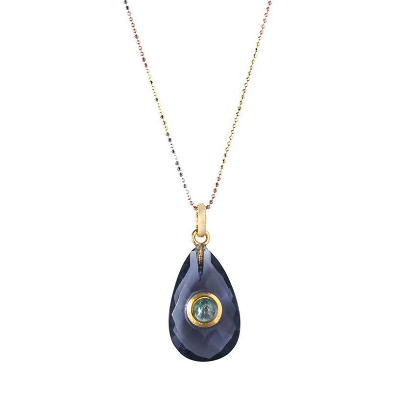 Colgante con piedra ovalada ahumada traslucida y circonita de color en talla cabujón central , cadena tricolor en plata, largo 40cm |