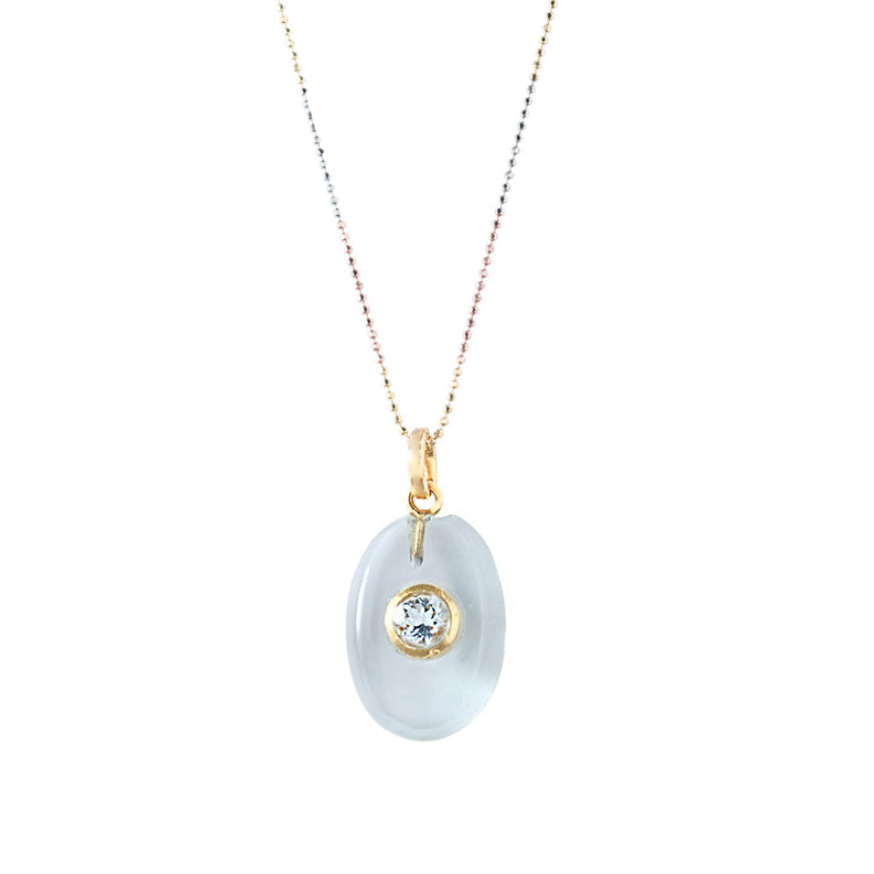 Colgante con piedra ovalada piedra traslucida y circonita blanca engastada en chaton central , cadena tricolor en plata, largo 40cm |