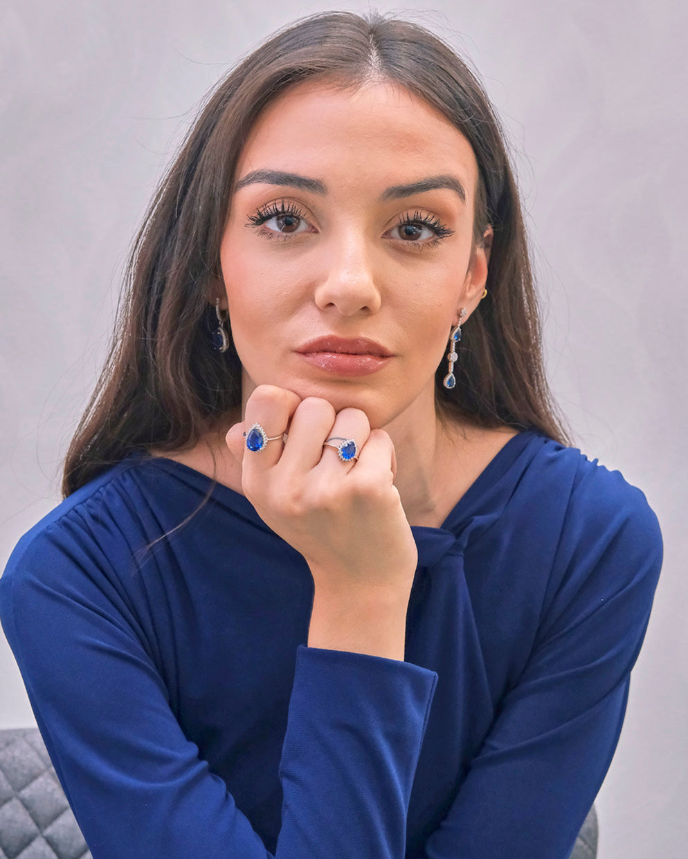 Anillo en plata con circonita central color zafiro talla pera y orla de circonitas alrededor