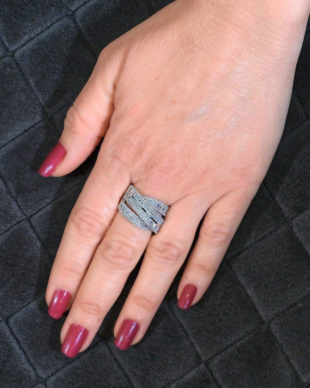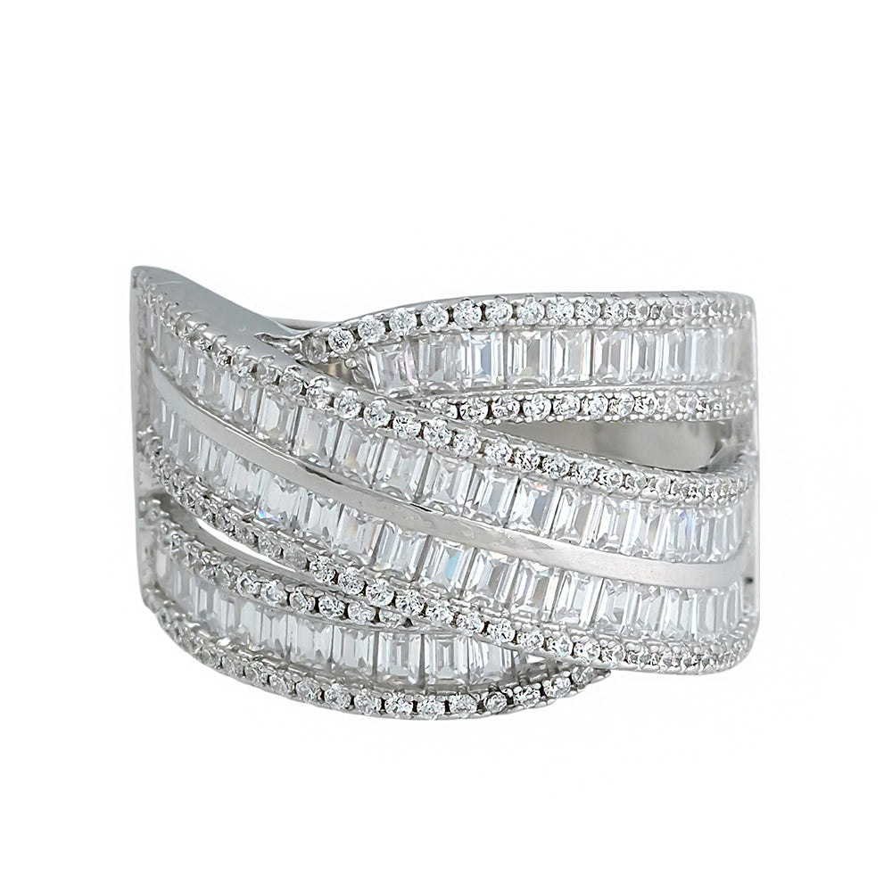 | Anillo joya en plata cruzado con filas en circonitas talla baguette, talla 19 |