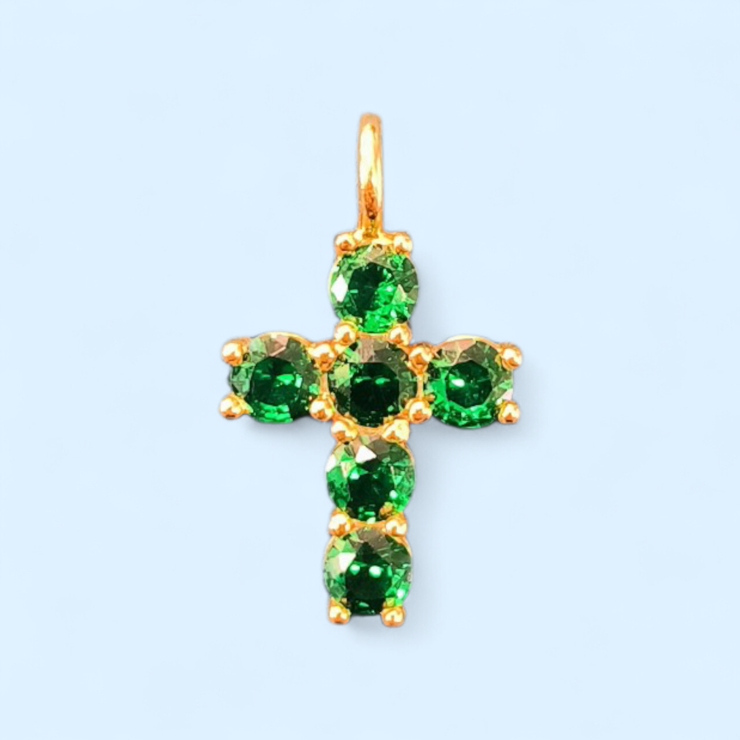 | Cruz en plata con baño de oro pequeña 1,5cm más anilla total 2cm, con circonitas de color verde esmeralda |
