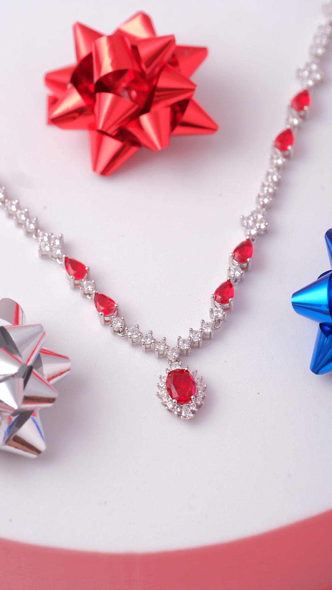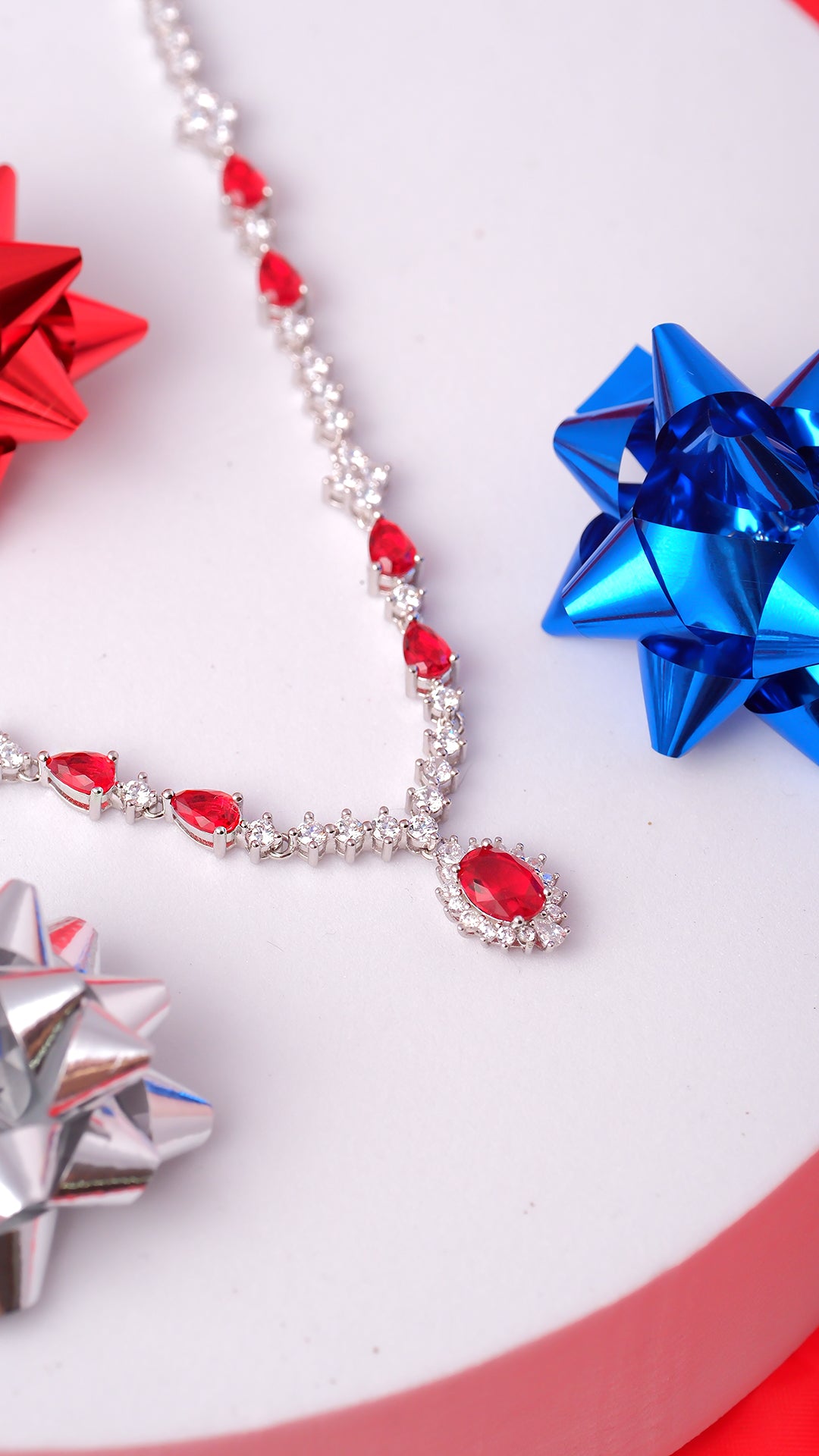 | Gargantilla en plata con circonitas y orla central con centro color rubi, cierre mosquetón, largo 40cm extensible a 45cm |