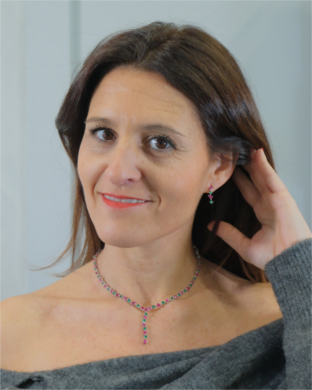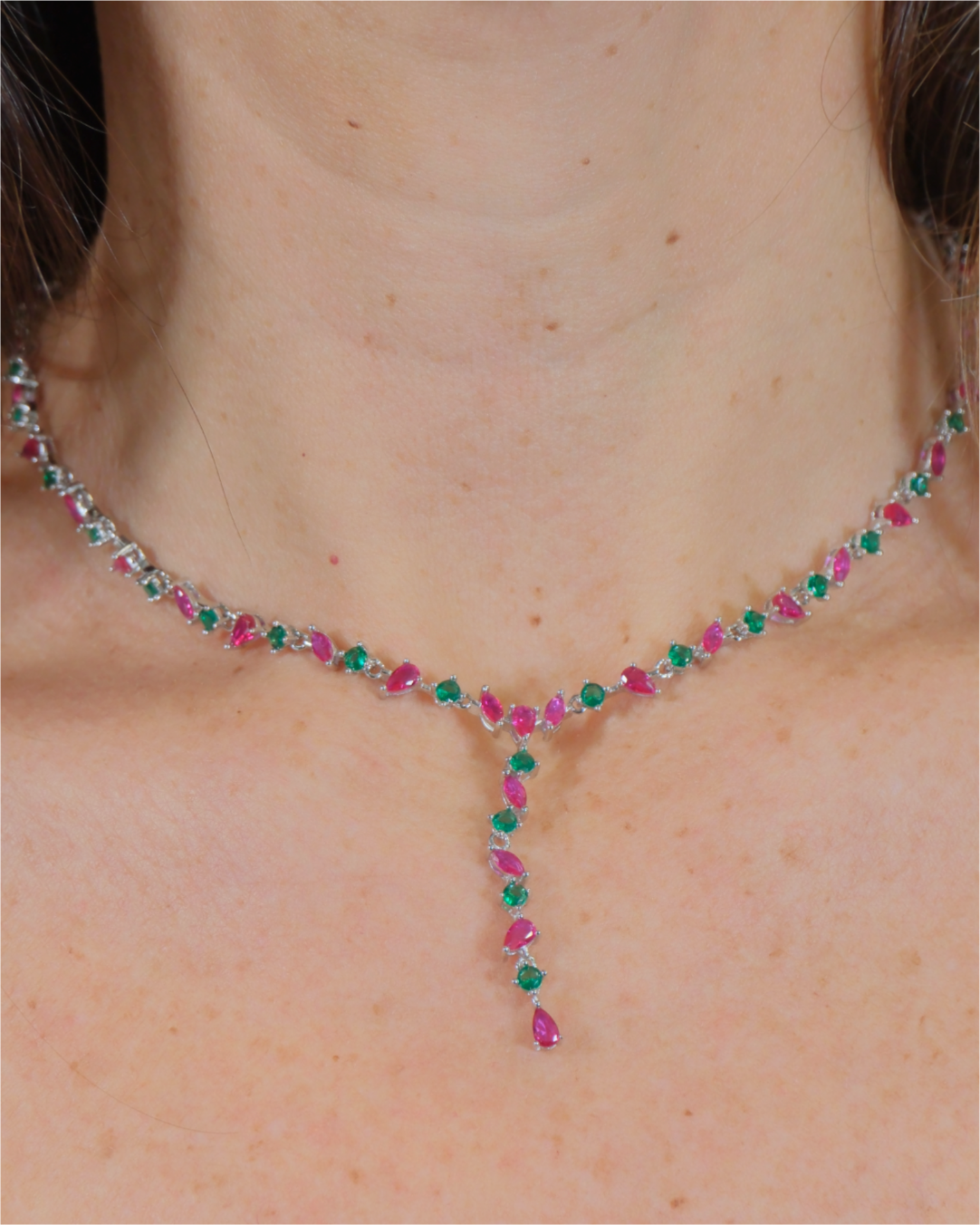 Gargantilla engastada en garras en color esmeralda y rubí