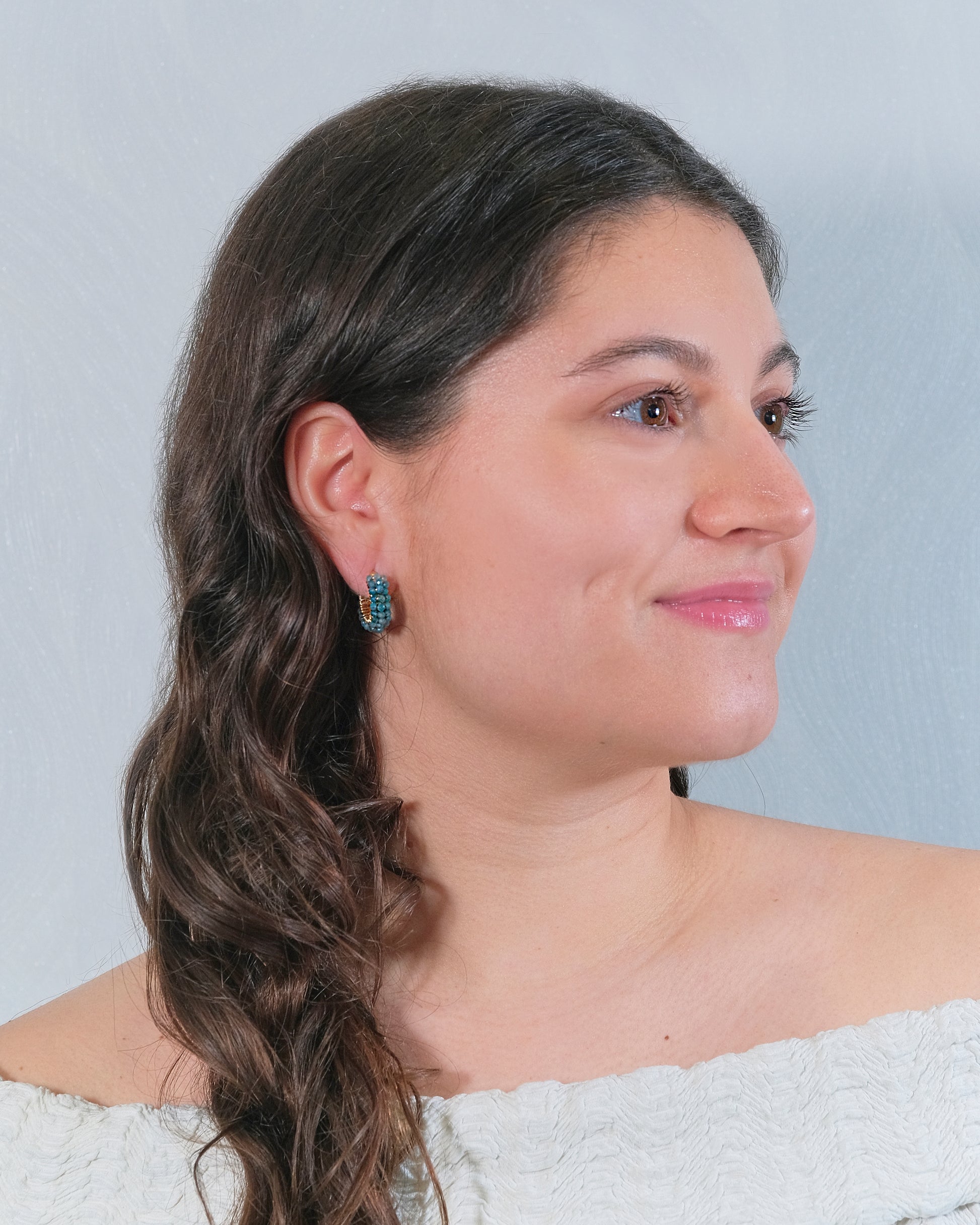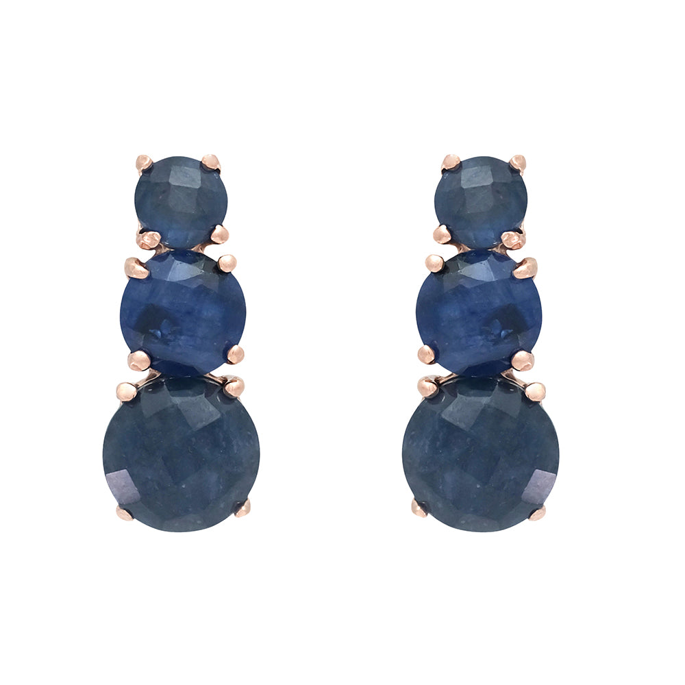 | Pendientes en plata con baño de oro rosa con 3 ágatas azules facetadas, cierre presión |
