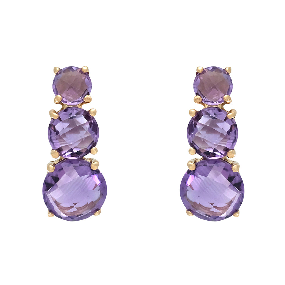 | Pendientes en plata con baño de oro amarillo con 3 amatistas facetadas, cierre presión |