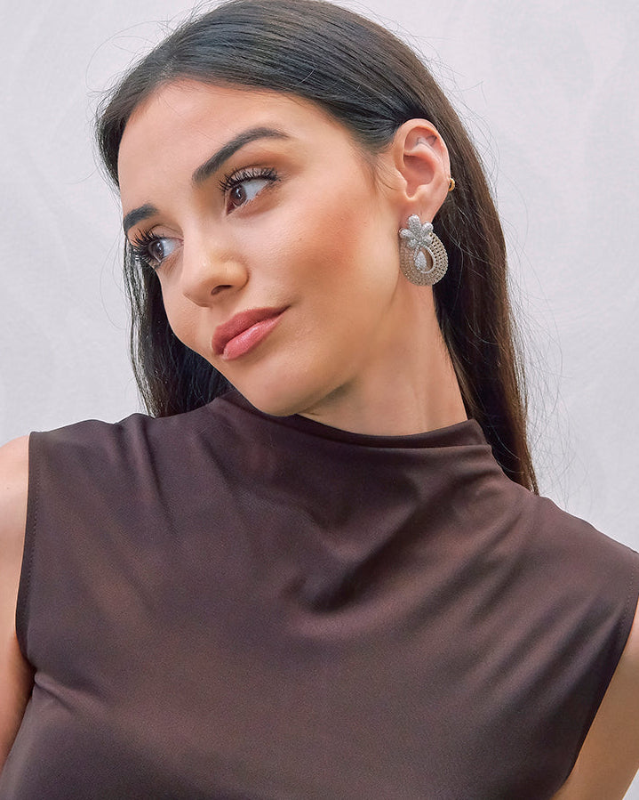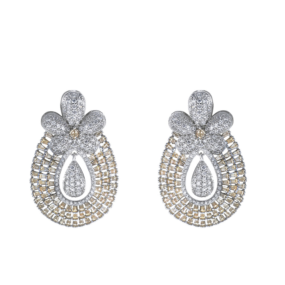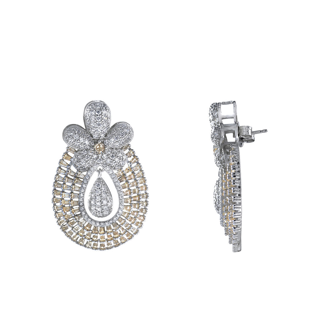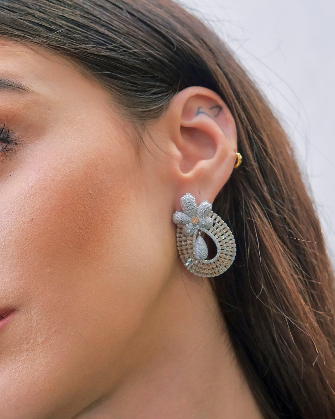 | Pendientes grandes en plata con flor en cuajado de circonitas blancas y a continuacion circonitas color champán en talla baguette, cierre presión, 4cm de ancho*2,6 de ancho |