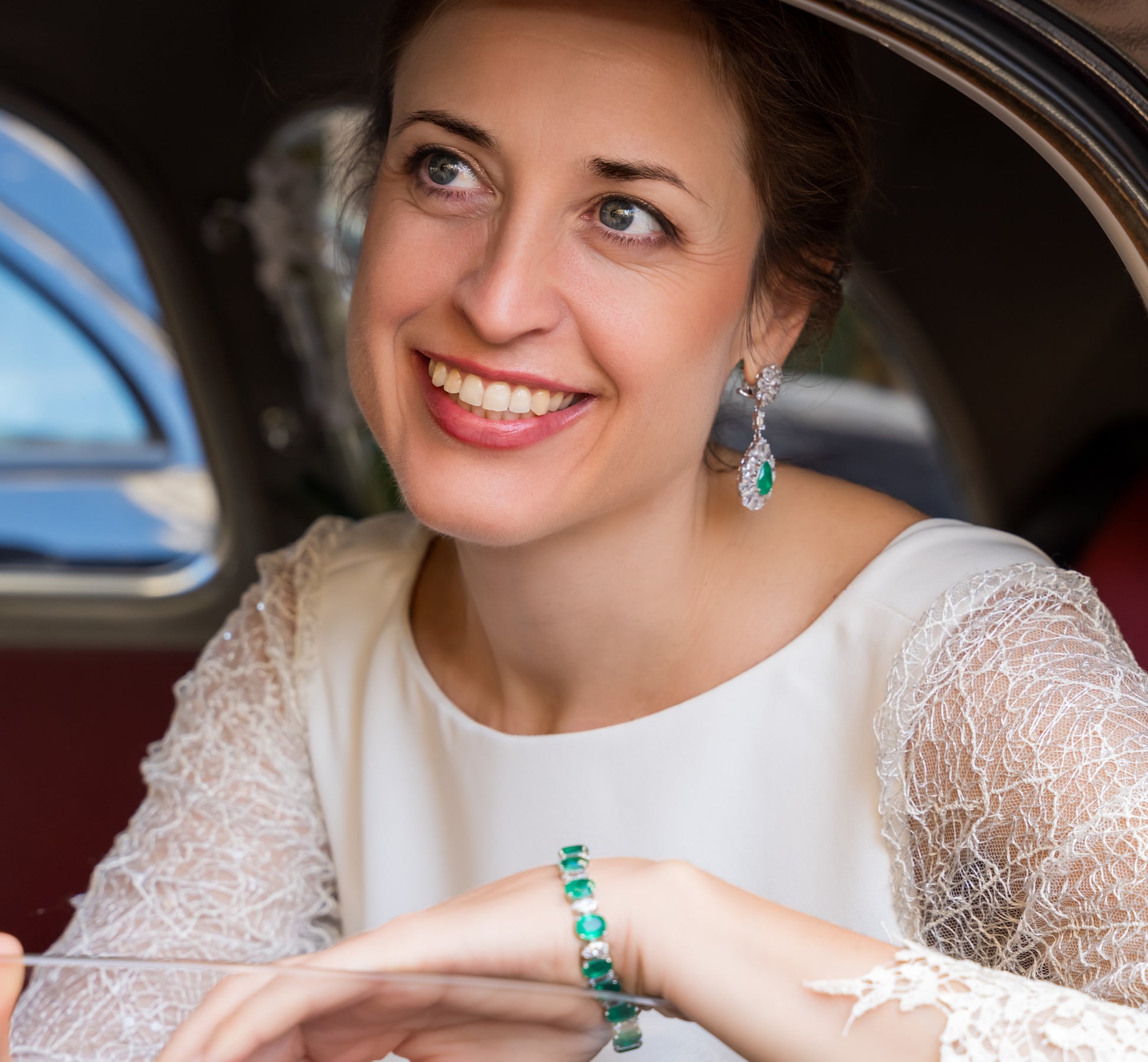Pendientes joya con circonitas en diferentes tallas y una orla con centro color esmeralda colgando