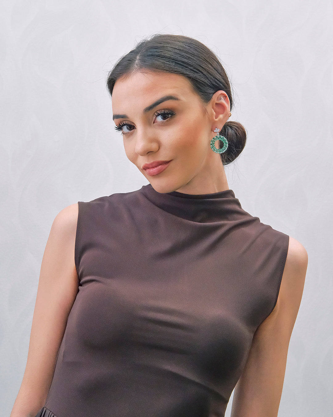 | Pendientes largos en plata en forma de círculos con circonitas verdes y blancas, largo 3,8cm, cierre presión |