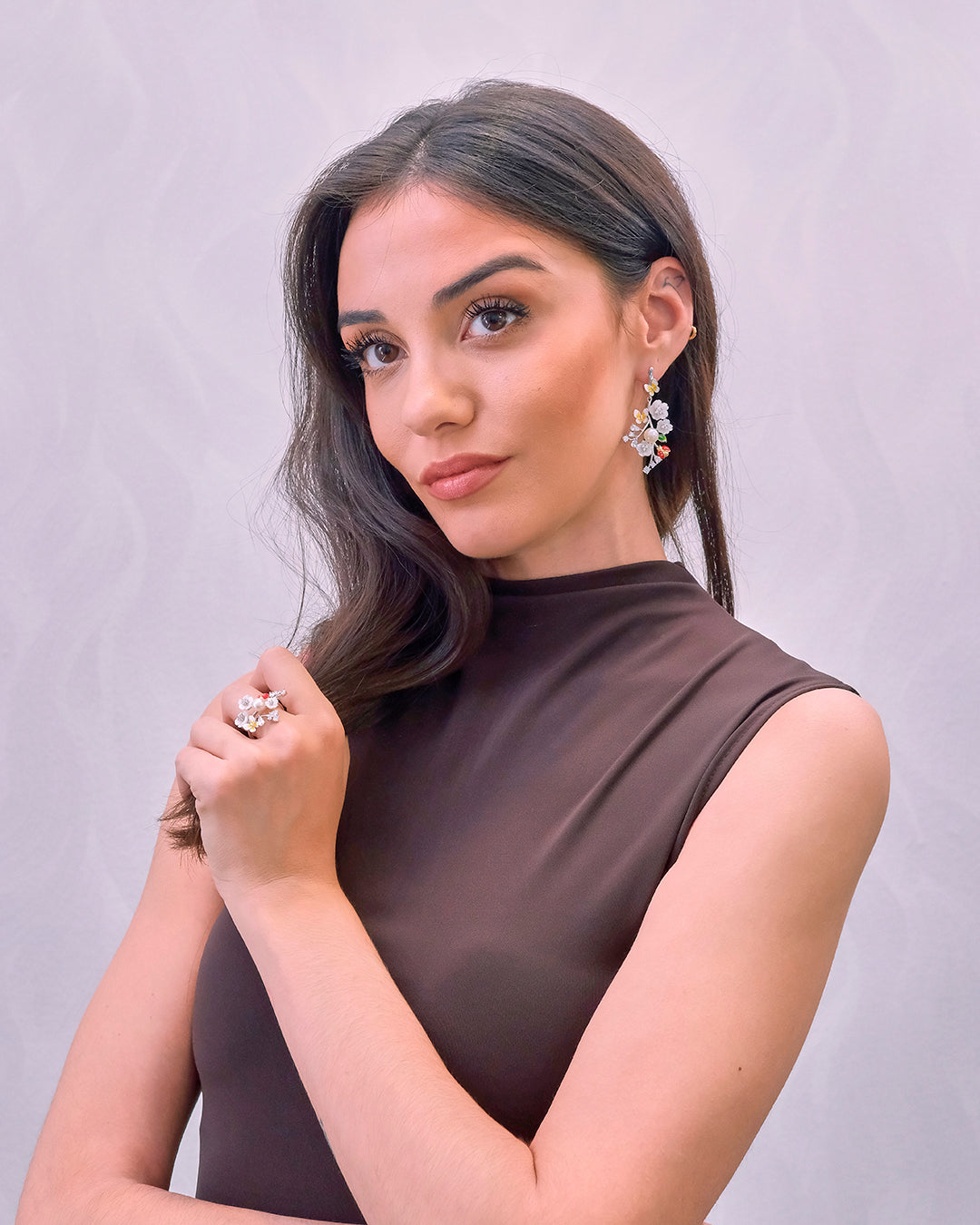 | Pendientes largos en plata con perlas, flores en nacar con circonitas, mariposas y mariquitas en esmalte, cierre ballestilla , largo 5cm |