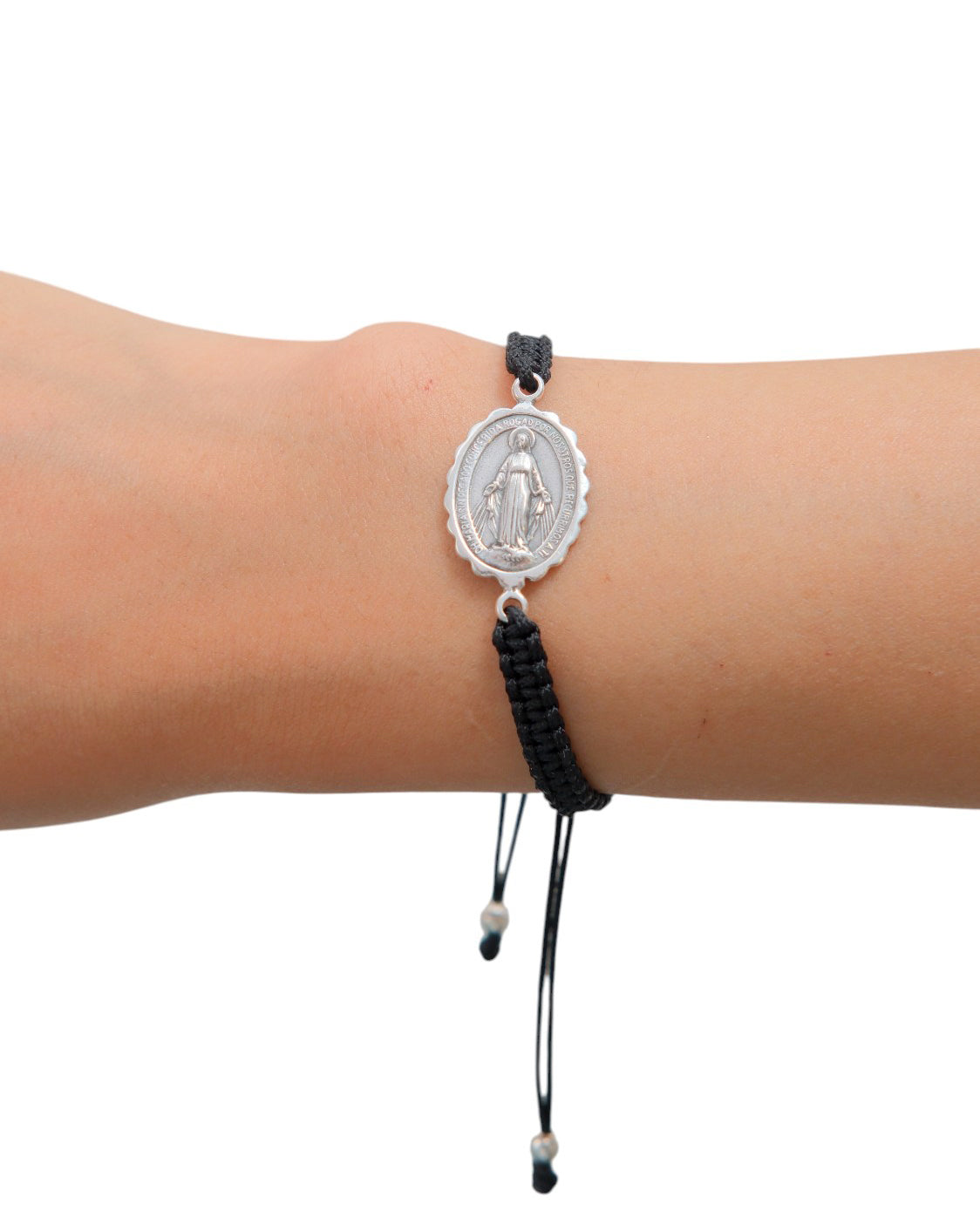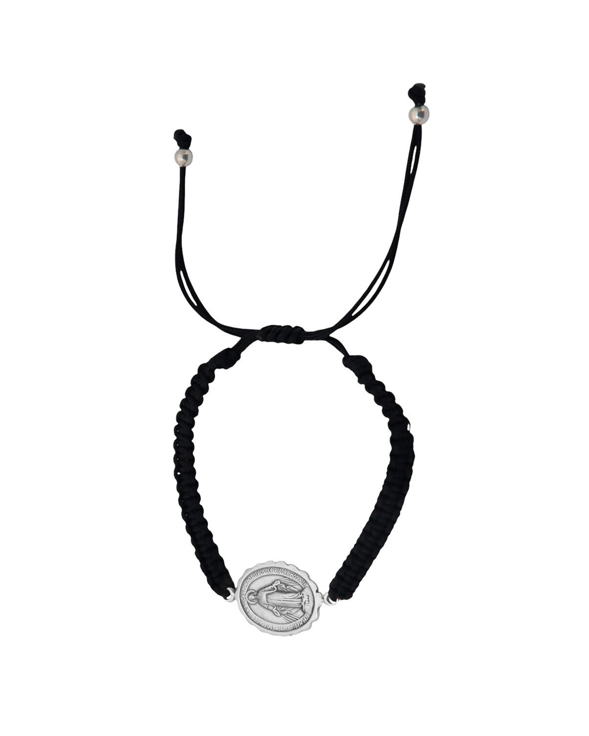 Pulsera macrame en negro con Virgen de la Milagrosa en plata, ajustable