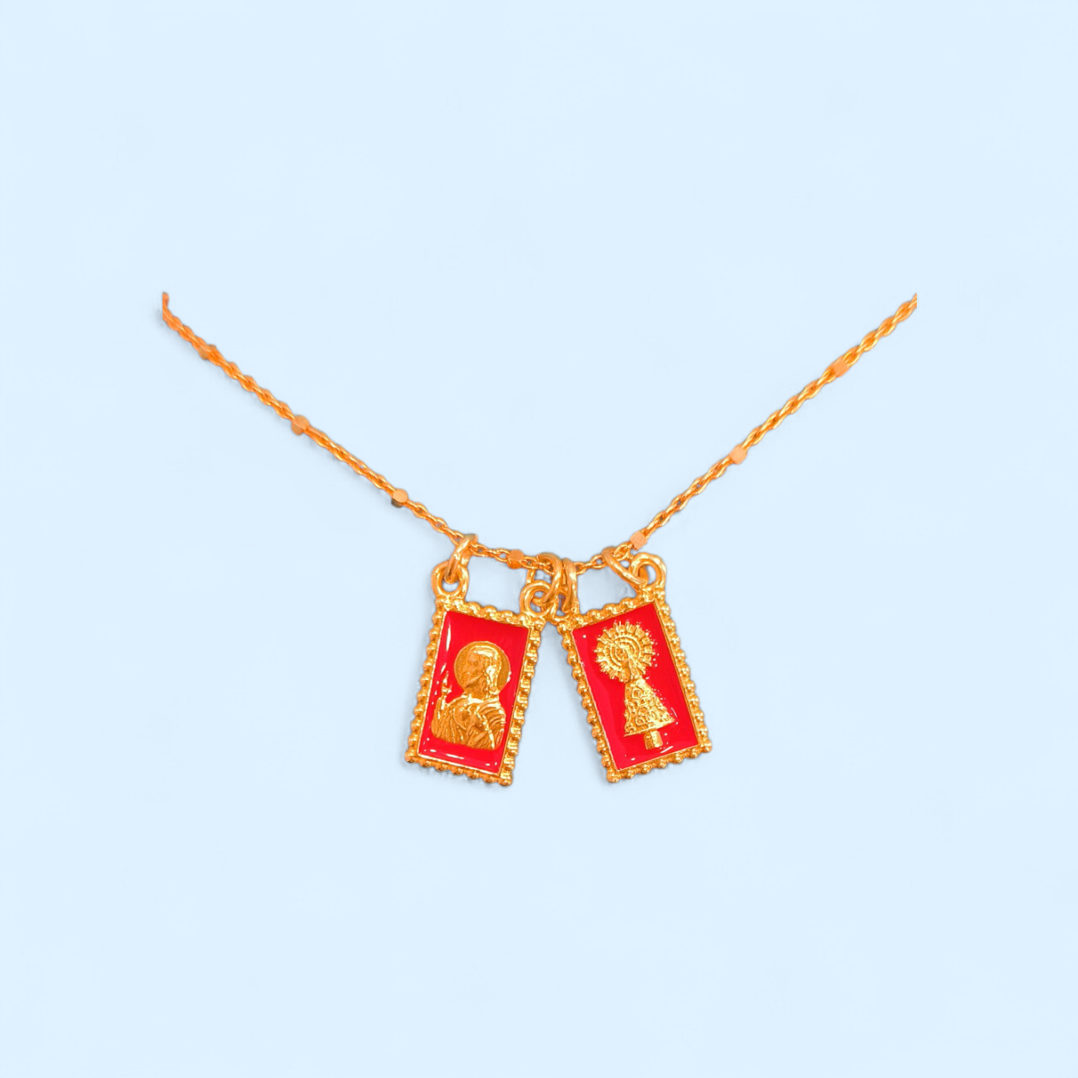 Cadena y medallas en plata con baño de oro Virgen del Pilar y Sagrado Corazón de Jesús en esmalte rojo, cadena ajustable 40 a 45cm |