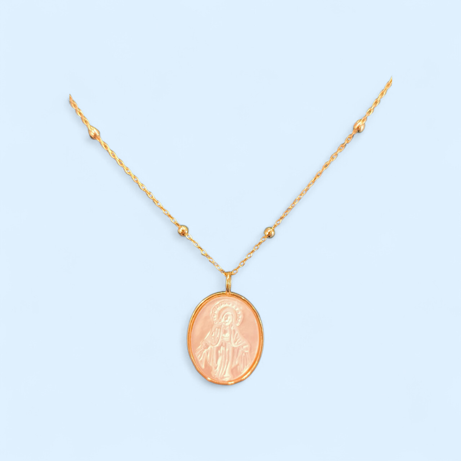 | Cadena con bolitas y medalla en plata con baño de oro Virgen de la Milagrosa en nácar, largo 40cm, cierre reasa |